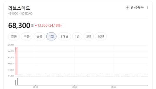 24일 코스닥 시장에 신규 상장한 리브스메드는 장 초반 공모가(5만 5000원) 대비 1만 3300원(24.18%) 오른 6만 8300원에 거래되고 있다.