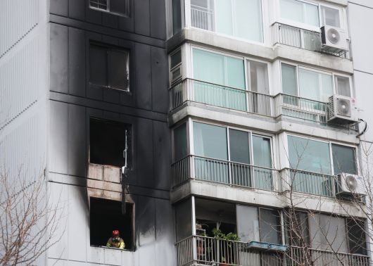 24일 오전 서울 송파구 방이동 한 아파트에서 불이 나 화재 현장 주변이 검게 그을려 있다./연합뉴스 |