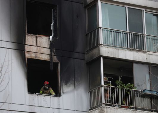 24일 오전 송파구 방이동 아파트 화재 현장에서 소방관이 잔불을 정리하고 있다. 연합뉴스 |