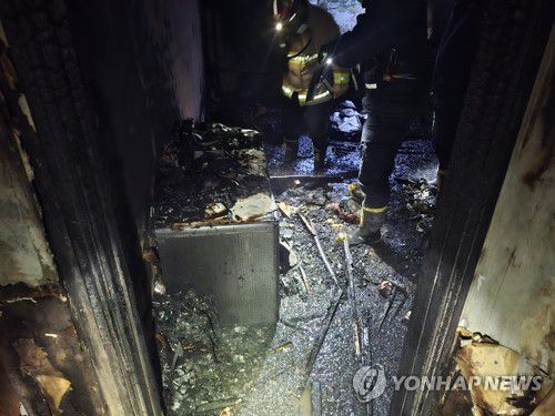 (서울=연합뉴스) 24일 서울 송파구 방이동 한 아파트에서 화재가 발생, 소방관들이 현장을 살펴보고 있다. 2025.12.24 [송파소방서 제공. 재판매 및 DB 금지]