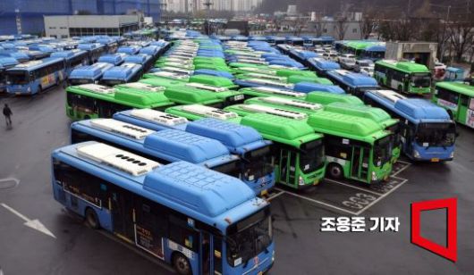 28일 서울 은평구의 한 버스차고지에 버스들이 주차돼 있다. 조용준 기자 |