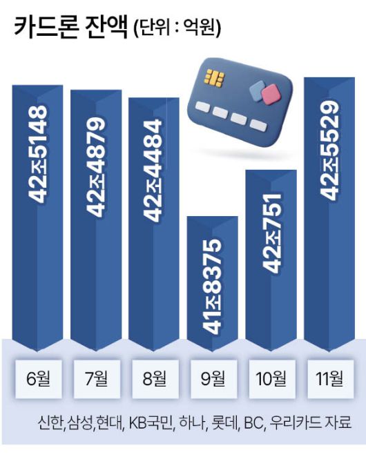 23일 여신금융협회 공시에 따르면 11월 기준 장기카드대출(카드론) 잔액은 약 42조5530억원으로, 전월 대비 4778억원 증가했다. 카드론 잔액은 강도 높은 대출 규제가 시작된 6월부터 9월까지 4개월 연속 감소했으나, 10월부터 다시 42조원대로 반등하며 두 달째 상승 곡선을 그리고 있다.