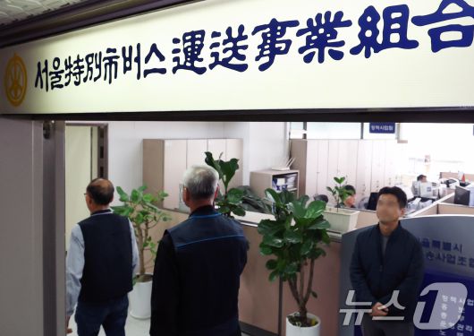 7일 오후 서울 송파구 서울버스운송사업조합에서 열린 서울시내버스 중앙노사교섭회의에서 서울시 버스노조 교섭위원들이 입장하고 있다. 2025.11.7/뉴스1 ⓒ News1 오대일 기자 |