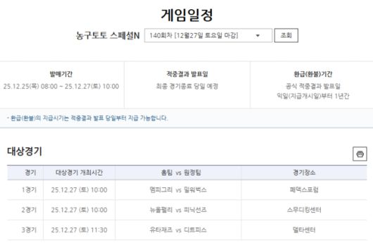 한편, NBA 3경기를 대상으로 한 농구토토 스페셜N 140회차는 25일(목) 오전 8시부터 12월 27일(토) 오전 10시까지 발매를 진행한다.
