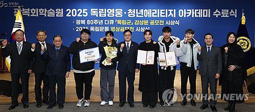 (서울=연합뉴스) 류효림 기자 = 우원식 국회의장(가운데)이 24일 서울 여의도 광복회관에서 열린 광복회학술원 에서 수상자들과 기념촬영을 하고 있다. 2025.12.24