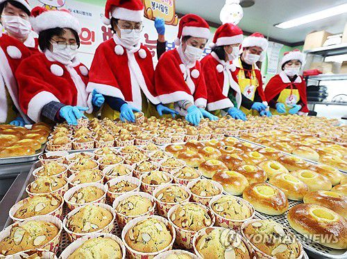 (안양=연합뉴스) 홍기원 기자 = 24일 경기도 안양시 동안구 대한적십자사 경기도지사 중앙봉사관에서 열린 ''에서 산타 모자를 쓴 봉사원들이 관내 지역아동센터 등에 전달할 빵을 준비하고 있다. 2025.12.24