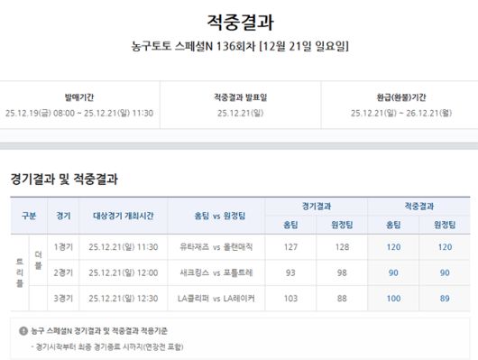12월 19일(금) 오전 8시부터 21일(일) 오전 11시 30분까지 발매한 농구토토 스페셜N 136회차에서는 트리플 게임 1건이 적중, 100만8315배의 배당률이 적용됐다. 이에 따른 환급금은 1억83만1500원이었다. 더블 게임에서는 73건이 적중됐으며 1295.5배가 적용됐고 총 1723만150원이 환급될 예정이다.