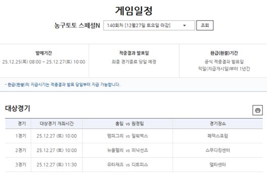 NBA 3경기를 대상으로 한 농구토토 스페셜N 140회차는 25일(목) 오전 8시부터 12월 27일(토) 오전 10시까지 구매할 수 있다.