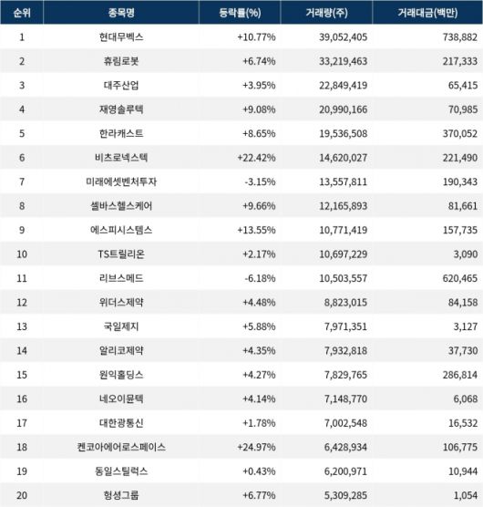 대주산업(003310)은 2760원으로 3.95% 상승하며, 거래량 2284만 9419주를 기록했다. 재영솔루텍(049630)은 3365원으로 9.08% 상승하며, 거래량 2099만 166주를 기록했다. 한라캐스트(125490)는 1만 8220원으로 8.65% 상승하며, 거래량 1953만 6508주를 기록했다. 비츠로넥스텍(488900)은 1만 6160원으로 22.42% 상승하며, 거래량 1462만 27주를 기록했다. 미래에셋벤처투자(100790)는 1만 5060원으로 3.15% 하락하며, 거래량 1355만 7811주를 기록했다. 셀바스헬스케어(208370)는 6470원으로 9.66% 상승하며, 거래량 1216만 5893주를 기록했다. 에스피시스템스(317830)는 1만 4160원으로 13.55% 상승하며, 거래량 1077만 1419주를 기록했다. TS트릴리온(317240)은 283원으로 2.17% 상승하며, 거래량 1069만 7229주를 기록했다.