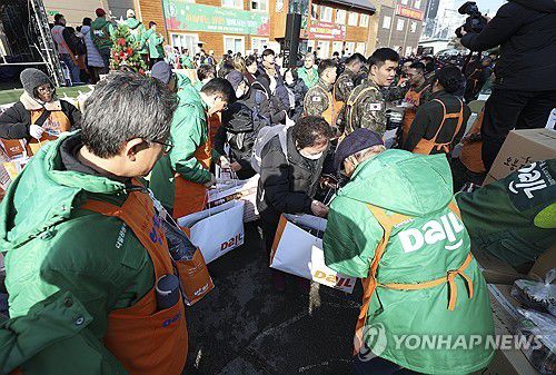 (서울=연합뉴스) 김성민 기자 = 크리스마스를 하루 앞둔 24일 서울 동대문구 밥퍼나눔운동본부에서 열린 거리 성탄 예배에서 자원봉사자들이 참가자들에게 음식과 생필품 등을 전달하고 있다. 2025.12.24 [공동취재]