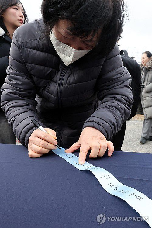 (무안=연합뉴스) 김혜인 기자 = 12·29 제주항공 여객기 참사 1주기를 닷새 앞둔 24일 무안국제공항 참사 현장에서 유가족들이 철조망에 매달 파란 리본에 추모 메시지를 적고 있다. 2025.12.24