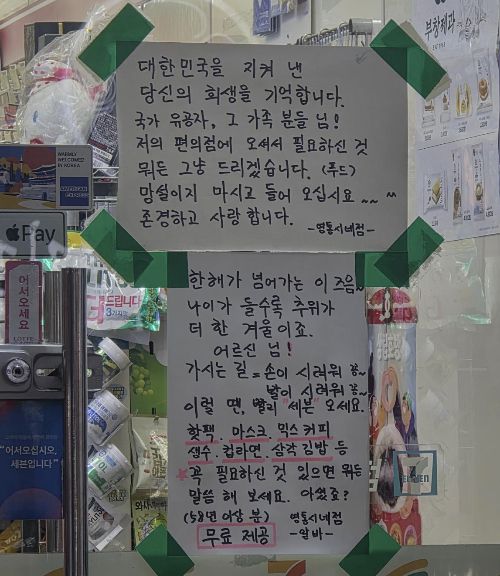 이 편의점 점주는 "대한민국을 지켜낸 당신의 희생을 기억한다"며 "국가유공자, 그 가족 분들 편의점에 오시면 필요하신 것 뭐든 그냥 드리겠다"고 썼다. 그러면서 "망설이지 말고 들어와달라"며 존경하고 사랑한다"고 했다.