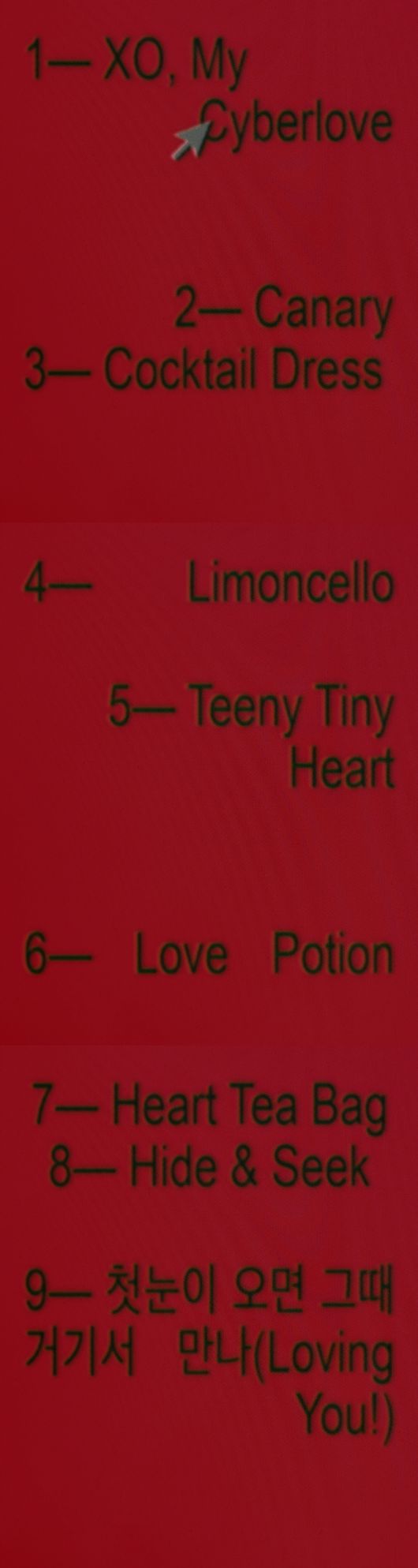 공개된 티저는 강렬한 레드 컬러 배경의 컴퓨터 모니터 화면을 연상시키는 구성으로 시선을 사로잡는다. 화면 속에는 검은색 타이핑으로 곡 제목들을 암시하는 리스트가 배열돼 있으며 타이틀곡 ‘엑스오, 마이 사이버러브’에 마우스 커서가 위치해 이번 앨범의 타이틀곡이라는 것을 직관적으로 드러냈다.