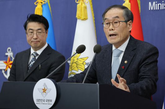이용철 방위사업청장이 24일 서울 용산구 국방부 브리핑룸에서 한국형 차기 구축함(KDDX) 사업추진방안 결정 내용 설명을 하고 있다. 왼쪽은 원종대 국방부 자원관리실장. 연합뉴스 |