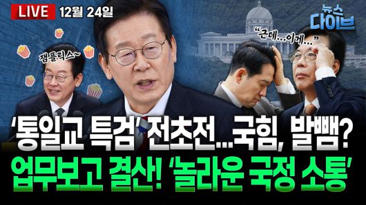 출연: 박지훈 변호사, 장윤선 정지천문기자, 김정환 변호사, 김규현 변호사, 김남일 한겨레 정치팀 기자, 진행: 고현준. ‘30시간’ 업무보고 생중계, 국정 소통 ‘한 획’ / 윤석열 구속 연장 심문... ‘내란재판부법’ 두고 “나치” 망발 / 통일교 특검 전초전, ‘추천권 전쟁’ / 통일교 특검, 하자는 건가 말자는 건가... 국힘 ‘의도적 파행’? / 부산서 마지막 업무보고... 이 대통령, 국정 소통 ‘한 획’ / 다급해 보이는 오세훈 ‘재판, 지선 이후로 미뤄달라’ / 성남시 ‘대장동 범죄수익 5173억’ 일단 묶었다. 오늘 (12월 24일) 뉴스 다이브 많은 시청바랍니다.