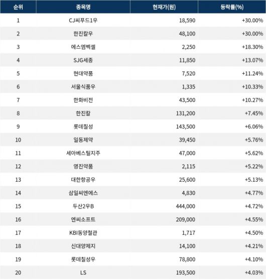 6위 서울식품우(004415)는 1,335원으로 +10.33% 상승 마감했다. 7위 한화비전(489790)은 종가 43,500원으로 +10.27% 상승 마감했다. 8위 한진칼(180640)은 종가 131,200원으로 +7.45% 상승 마감했다. 9위 롯데칠성(005300)은 143,500원으로 +6.06% 상승 마감했다. 10위 일동제약(249420)은 39,450원으로 +5.76% 상승 마감했다.