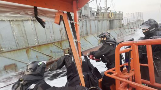 해경이 불법조업을 하는 중국어선을 나포하기 위해 와이어를 자르고 있다. 중부지방해양경찰청 제공 |
