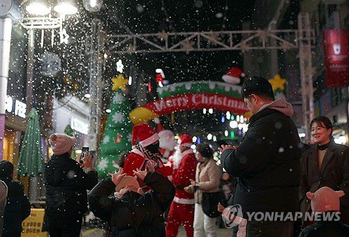 (창원=연합뉴스) 김동민 기자 = 크리스마스(성탄절)를 하루 앞둔 24일 오후 경남 창원시 마산합포구 창동에서 인공 눈이 내리고 있다. 2025.12.24
