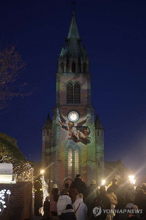 (서울=연합뉴스) 서대연 기자 = 크리스마스를 하루 앞둔 24일 서울 중구 명동대성당에 성탄절 기념 미디어파사드가 흘러나오고 있다. 2025.12.24