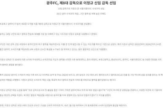 이정효 감독을 떠나보낸 광주FC가 이날 오후 '제8대 감독으로 이정규 전 이랜드 수석코치를 선임했다'고 공식발표했다. '2022년 광주FC 수석코치 부임 이후 K리그2 다이렉트 승격 및 우승, 2023년 K리그1 3위 달성과 구단 최초 AFC 챔피언스리그 엘리트(ACLE) 진출 등 구단 역사에 남을 성과를 만든 지도자'라고 선임 배경을 설명했다. 이정규 감독은 취임 소감을 통해 "프로 감독으로서의 첫 출발을 좋은 기억이 가득한 광주FC에서 하게 돼 매우 영광스럽다"며 "구단이 추구해 온 방향성을 존중하고, 다양한 의견에 귀 기울이며 항상 최선의 선택을 하겠다. 제 모든 열정과 책임감을 바탕으로 광주FC를 더욱 경쟁력 있는 팀으로 만들어가겠다"고 각오를 밝혔다.