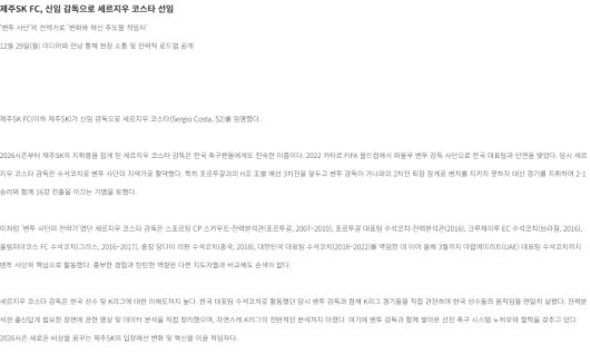 이어 제주 SK가 '벤투 사단의 전략가'의 세르지우 코스타 신임 감독을 선임했다는 뉴스가 전해졌다. 코스타 감독은 "2018년부터 시작한 한국에서의 삶은 정말 최고였다. 한국을 떠난 뒤 사람, 생활, 음식 모든 부분이 다 그리웠다. 가족들도 내게 다시 한국에 가고 싶다는 말을 했을 정도였다. 무엇보다 한국 팬들에게 정말 뜨거운 사랑을 받았다. 다시 한국으로 돌아와 K리그라는 무대에서 그 사랑에 보답할 수 있는 기회를 준 제주SK에게 정말 감사하다는 말을 전하고 싶다. 첫 감독이라는 새로운 도전을 제주SK의 모든 구성원들과 함께 할 수 있어 크나큰 영광이다. 2025시즌 제주SK가 정말 힘들었다는 것도 잘 알고 있기에 책임감과 동기부여는 그 어느 때보다 크다. 정말 진심을 다해 제주SK의 지휘봉을 잡도록 하겠다"라고 취임 일성을 전했다.