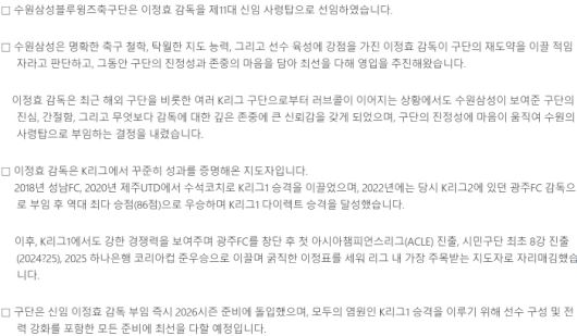 가장 먼저 K리그에서 가장 핫한 감독. 이정효 감독의 수원 삼성 제11대 감독 선임 소식이 전해졌다. "명확한 축구 철학, 탁월한 지도 능력, 그리고 선수 육성에 강점을 가진 이정효 감독이 구단의 재도약을 이끌 적임자라고 판단하고, 그동안 구단의 진정성과 존중의 마음을 담아 최선을 다해 영입을 추진해왔다"며 새 감독 선임을 공식화했다. "이정효 감독은 최근 해외 구단을 비롯한 여러 K리그 구단으로부터 러브콜이 이어지는 상황에서도 수원삼성이 보여준 구단의 진심, 간절함, 그리고 무엇보다 감독에 대한 깊은 존중에 큰 신뢰감을 갖게 되었으며, 구단의 진정성에 마음이 움직여 수원의 사령탑으로 부임하는 결정을 내렸다"고 설명했다.
