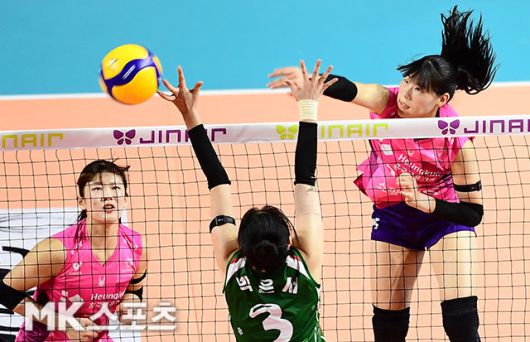 흥국생명 정윤주가 상대 블로커를 앞에 두고 스파이크를 날리고 있다.