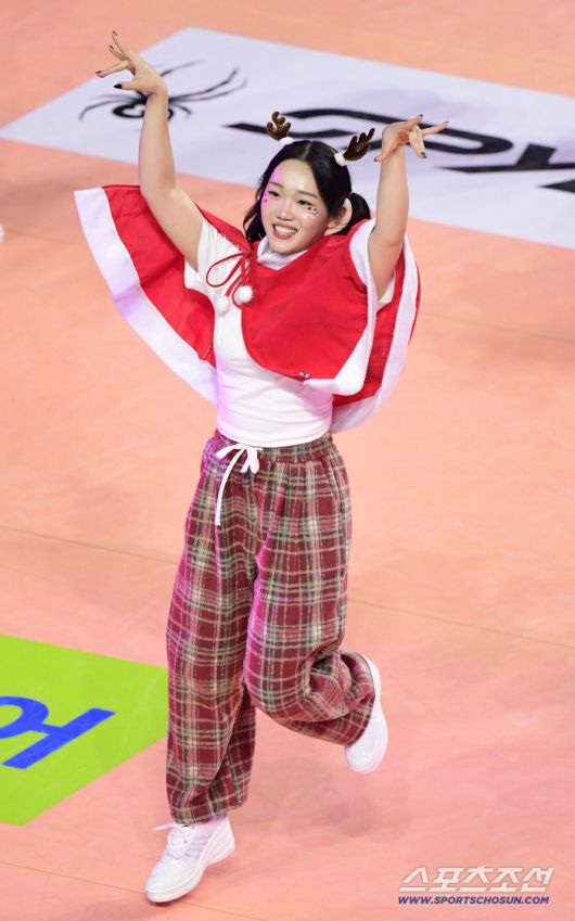 24일 인천 삼산월드체육관에서 열린 V리그 여자부 흥국생명과 IBK기업은행의 경기. 산타 복장으로 무대를 펼치고 있는 흥국생명 치어리더들. 인천=송정헌 기자songs@sportschosun.com/2025.12.24/