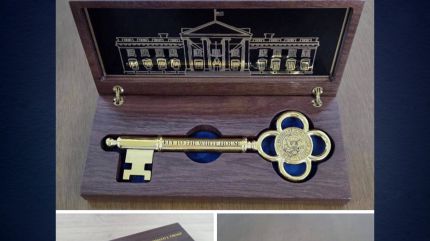 백악관 황금 열쇠는 트럼프 대통령이 특별한 손님에게 주기 위해 직접 디자인한 것으로, 미국 대통령이란 표현과 함께 백악관 열쇠라는 문구가 새겨져 있습니다.