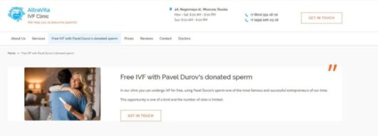 두로프는 수년 전 정자 기증을 중단했지만, 여전히 모스크바의 한 난임 병원에는 그의 냉동 정자가 보관돼 있는 것으로 전해졌다. 이 병원은 “유명 기업가이자 성공한 사업가인 파벨 두로프의 정자를 활용한 체외수정(IVF)을 무료로 받을 수 있다”며 이를 홍보하고 있다고 WSJ은 전했다.