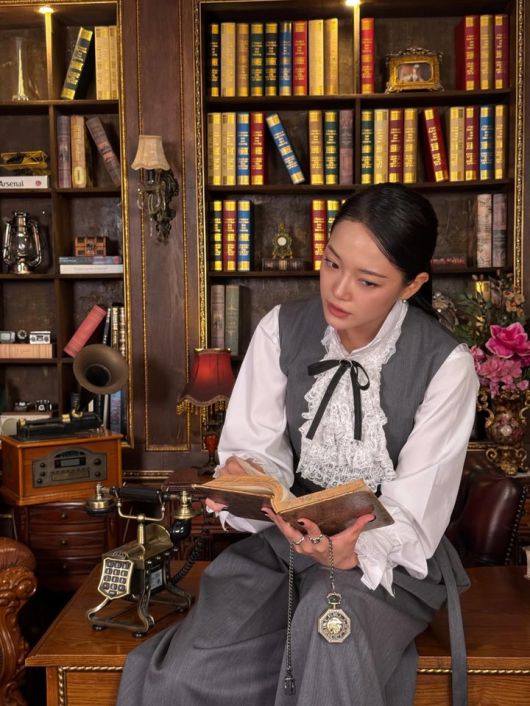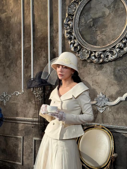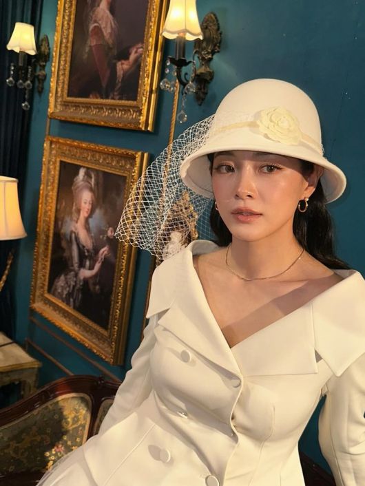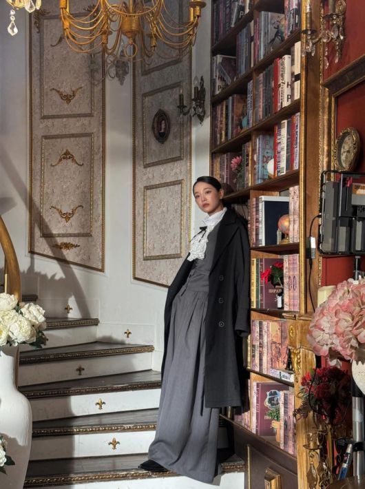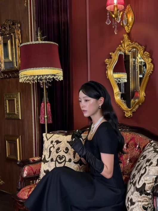 레드 톤의 앤티크 공간과 만나 빈티지한 감성이 극대화됐고, 매끈하게 넘긴 헤어와 또렷한 아이라인이 고전 영화 같은 분위기를 더했다.