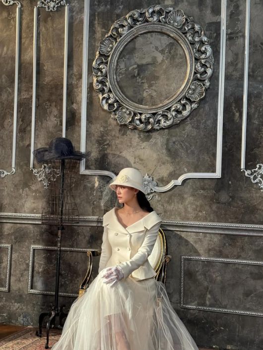 공개된 사진 속 김세정은 크림 컬러 재킷과 플리츠 스커트에 레이스 장갑, 플라워 장식이 더해진 하얀 모자를 매치해 '빈티지 브라이덜' 무드를 완성했다.