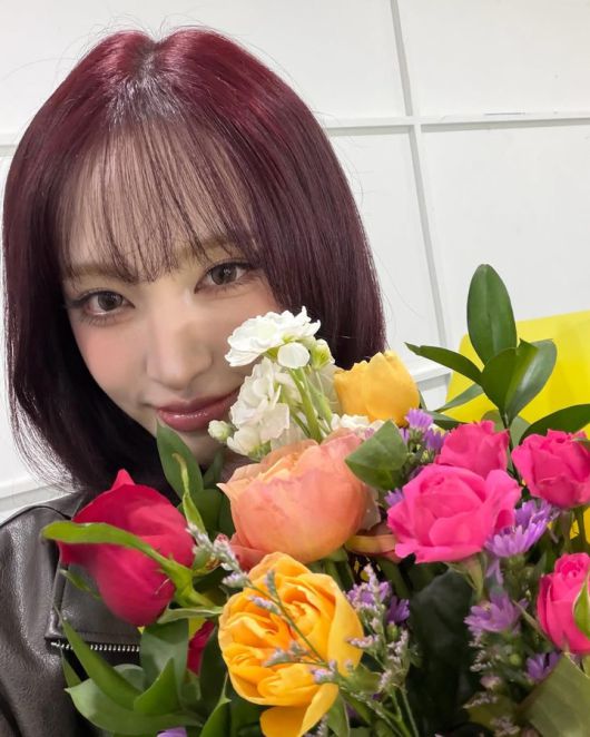 또 다른 사진에서는 꽃다발을 얼굴 가까이 든 초근접샷으로 시선을 끌었다. 핑크·옐로 컬러가 섞인 꽃다발과 리즈의 은은한 미소가 어우러지며, 차분한 설렘을 그대로 전했다.