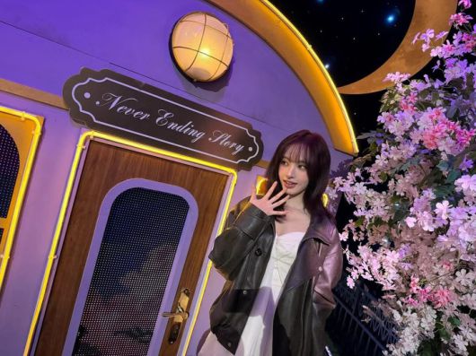 공개된 사진 속 리즈는 블랙 레더 재킷 위에 하얀 원피스를 매치해 '청순+시크'의 반전 조합을 완성했다. 퍼플 톤 조명과 별빛이 깔린 공간, 초승달 오브제가 더해지며 한 편의 동화 같은 분위기다.