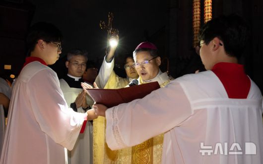 [서울=뉴시스] 황준선 기자 = 천주교 서울대교구장 정순택 대주교가 성탄절인 25일 서울 중구 명동대성당 앞마당에서 주님 성탄 대축일 밤 미사를 앞두고 아기 예수를 말 구유에 안치하는 '구유 예절' 의식을 하고 있다. 2025.12.25. hwang@newsis.com