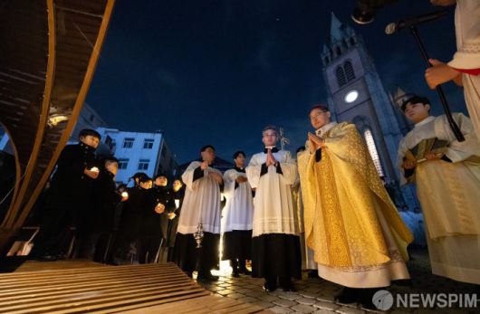 [서울=뉴스핌] 최지환 기자 = 천주교 서울대교구장 정순택 대주교가 성탄절인 25일 서울 중구 명동대성당 앞마당에서 주님 성탄 대축일 밤 미사를 앞두고 아기 예수를 말 구유에 안치하는 '구유 예절' 의식을 하고 있다. 2025.12.25 choipix16@newspim.com