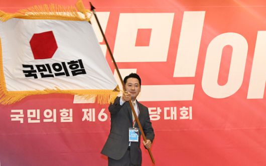 지난 8월 26일 서울 여의도 국회도서관에서 열린 국민의힘 제6차 전당대회 결선에서 당대표로 당선된 장동혁 후보가 당기를 흔들고 있다. 국회사진기자단 |