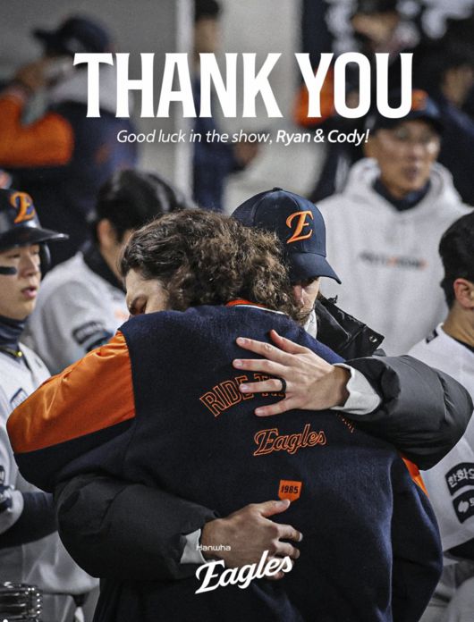 한화 이글스 공식 SNS 계정은 24일, 폰세와 와이스가 포옹하는 사진을 게재하면서 두 명의 선수와 공식적인 작별을 하게 됐음을 알렸다. 한화는 “라이언 와이스와 코디 폰세는 팀을 한국시리즈로 이끈 역대급 활약을 바탕으로 더 넓은 무대를 향해 도전을 이어갑니다”며 작별을 고했다.