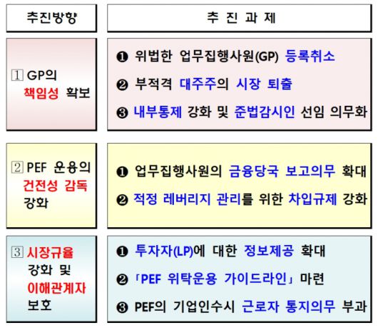 부적격 사모펀드 대주주의 시장 퇴출에 대한 근거도 선진국 기준을 따랐다. 미국은 GP의 등록자격을 판단할 때 대주주의 10년간 민형사 행정법규 위반 이력을 중요하게 본다. 유럽은 10% 이상 보유주주에 대해 운용사 건전 경영 여부 평가항목이 있다.