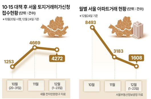이와 비교해 토지거래허가신청 건수의 추이를 보면 감소 폭의 차이가 크다. 헤럴드경제가 새올 전자민원창구에 올라온 서울 자치구별 토지거래허가 신청 건수를 집계한 결과에 따르면 12월(1~23일 기준) 접수 건수는 4272건으로 11월(4669건) 대비 8.5% 감소했다. 토지거래허가 대상에 비아파트도 포함된다는 점을 감안해도 격차가 5배를 초과하는 셈이다. 아파트 거래 비중이 그게 달라지지 않았다면 실제 거래 수요가 급감했다기보다 허가·신고 절차로 인해 거래가 통계상 뒤로 밀려났을 가능성이 제기된다.