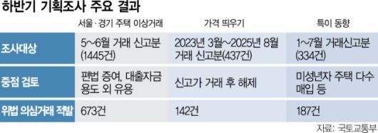 국토부는 24일 국무조정실 부동산 감독 추진단이 주관한 ‘제4차 부동산 불법행위 대응 협의회’에서 기획조사 결과를 발표했다. 이번 조사는 △서울·경기 주택 이상 거래 △부동산 실거래가 띄우기 △전세사기 등 특이 거래 등 세 분야에 대해 실시됐다.