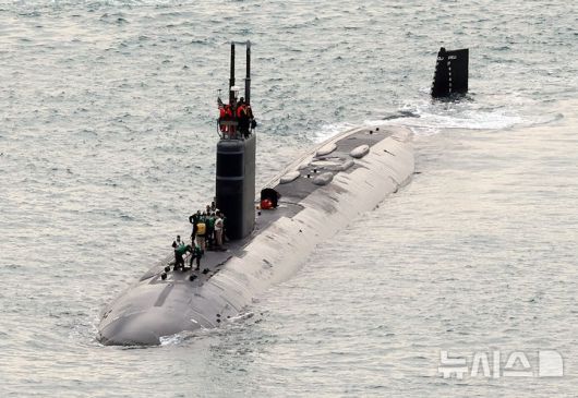 [부산=뉴시스] 하경민 기자 = 미국 해군의 로스앤젤레스급(LA급) 공격형 핵추진 잠수함 '그린빌함'(SSN-772·6900t급)이 23일 오전 부산 남구 해군작전사령부 부산작전기지에 입항하고 있다. 길이 110m, 폭 10m, 승조원 140여 명인 이 잠수함은 토마호크 순항미사일 및 12개의 수직발사시스템(VLS), MK48 어뢰 및 4개의 발사관 등을 갖추고 있다. 2025.12.23. yulnetphoto@newsis.com |