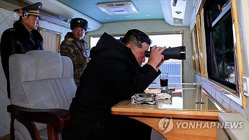 (서울=연합뉴스) 북한 김정은 국무위원장이 지난 24일 신형 고공 장거리 반항공(대공) 미사일 시험 발사를 쌍안경으로 참관하고 있다. [조선중앙TV 화면] 2025.12.25