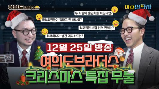 25일 한국일보 시사유튜브 '이슈전파사'가 크리스마스 특집 방송 '무엇이든 물어보세요'를 진행한다. 이날 방송에서는 '여의도 브라더스' 김정현ㆍ김도형 기자가 출연해 사전에 유튜브 게시물을 통해 받은 질문과 방송 중 실시간 채팅으로 올라오는 질문에 답하며 시청자와 소통을 이어나갈 예정이다.
