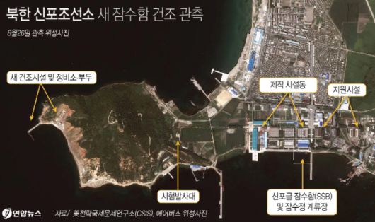 북한 신포조선소 새 잠수함 건조 관측, 북한이 신포조선소에서 새로운 탄도미사일 잠수함(SSB)을 건조하며 새로운 잠수함발사탄도미사일(SLBM) 발사 실험을 준비 중일 가능성을 제기하는 미국 싱크탱크의 분석이 나왔다. 2019.08.29 연합 |