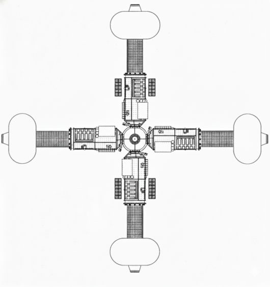 특허 상세 문서를 보면 에네르기아 우주정거장은 십(十)자와 비슷한 형상이다. 중심축에 기다란 막대기 형상의 인간 거주 공간 4개가 90도 각도를 유지하면서 부착돼 있다.