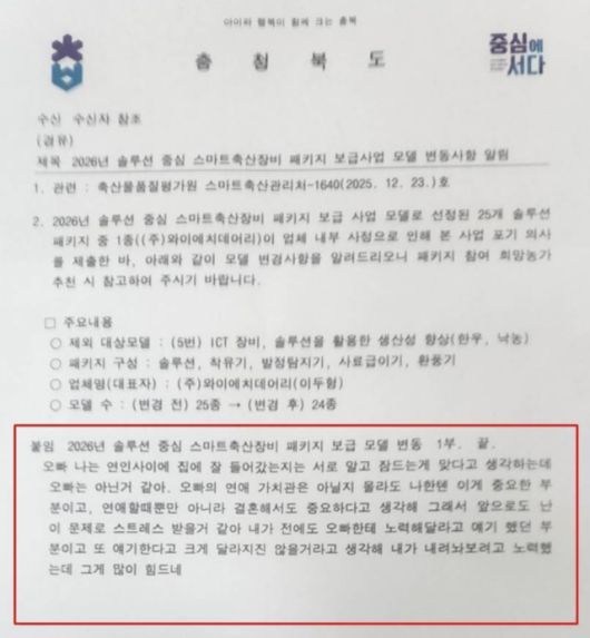 논란의 공문은 ‘2026년 솔루션 중심 스마트 축산장비 패키지 보급 사업 모델 변동 사항 알림’으로, 지난 24일 청주시와 충주시를 포함한 도내 전 시·군 축산 관련 부서에 배포됐다. 해당 공문에는 사업 추진과 관련한 행정 안내 내용이 담겨 있었다.
