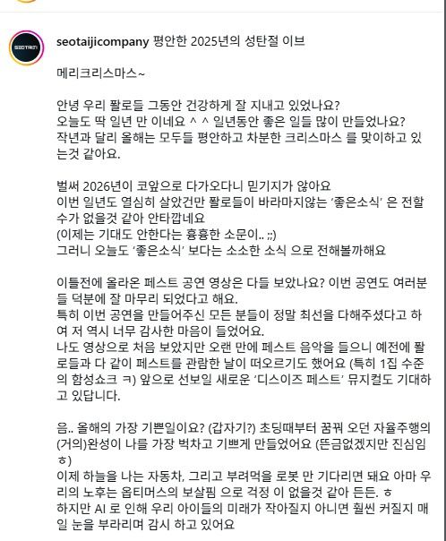 서태지는 “아무리 바빠도 가장 중요한 건강 꼭 챙기자. 육아, 직장 등 힘든 일이 많을 거다. 하지만 우리들만의 따뜻한 추억으로 멀리 있어도 서로 깊은 의지가 됐으면 좋겠다. 모두들 따뜻한 크리스마스 보내고 남은 25년도 멋지게 마무리하길 바란다”고 덧붙였다.