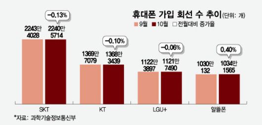 구체적으로 SK텔레콤은 2만8314개(0.13%), KT는 1만3640개(0.10%), LG유플러스는 6407개(0.06%) 각각 감소했다. 반면 알뜰폰은 4만1433개(0.40%) 증가하며 이통3사와 뚜렷한 대조를 이뤘다.