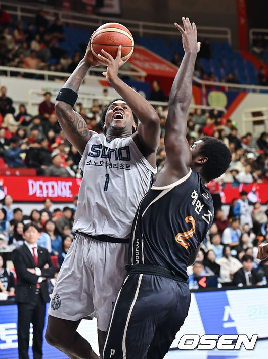 고양 소노 네이던 나이트가 울산 현대모비스 레이션 해먼즈의 마크를 피해 골밑슛을 시도하고 있다. 2025.12.25 / foto0307@osen.co.kr